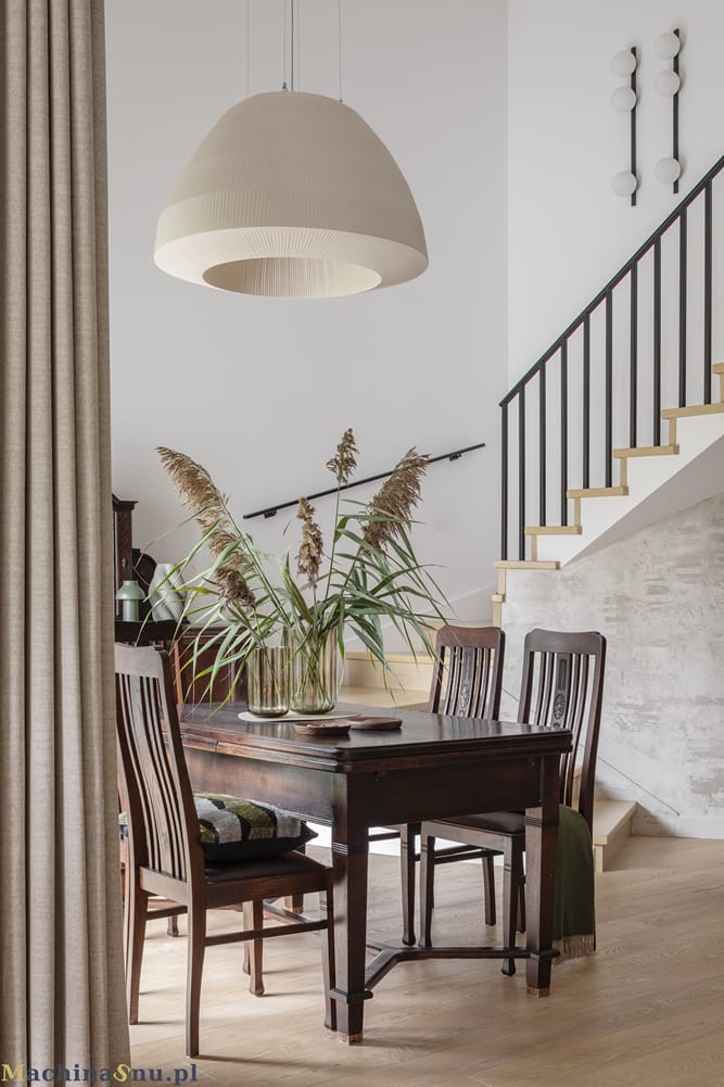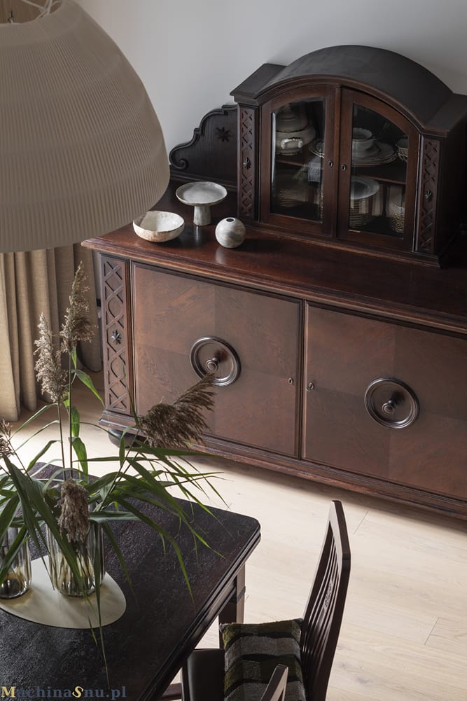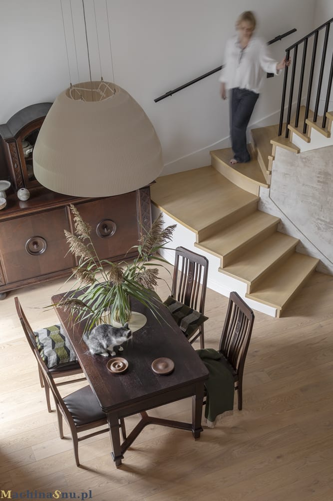 Sercem strefy wypoczynkowej jest duża sofa, uzupełniona o lekkie fotele na czarnych, metalowych nogach. Paleta barw opiera się na jasnych, naturalnych odcieniach bieli, szarości i beżów, które odbijają światło wpadające przez duże przeszklenia prowadzące do ogrodu. Całość ocieplają naturalne materiały i faktury: dębowa podłoga i wysokiej jakości tkaniny. Najważniejszym elementem, który nadaje wnętrzu unikalną duszę, są odziedziczone po dziadkach antyczne meble jadalniane – stół, krzesła i kredens. Nowoczesna, minimalistyczna przestrzeň stała się dla nich rodzajem galerii, w której ich rzemieślniczy detal i bogata historia mogły w pełni zabłysnąć.