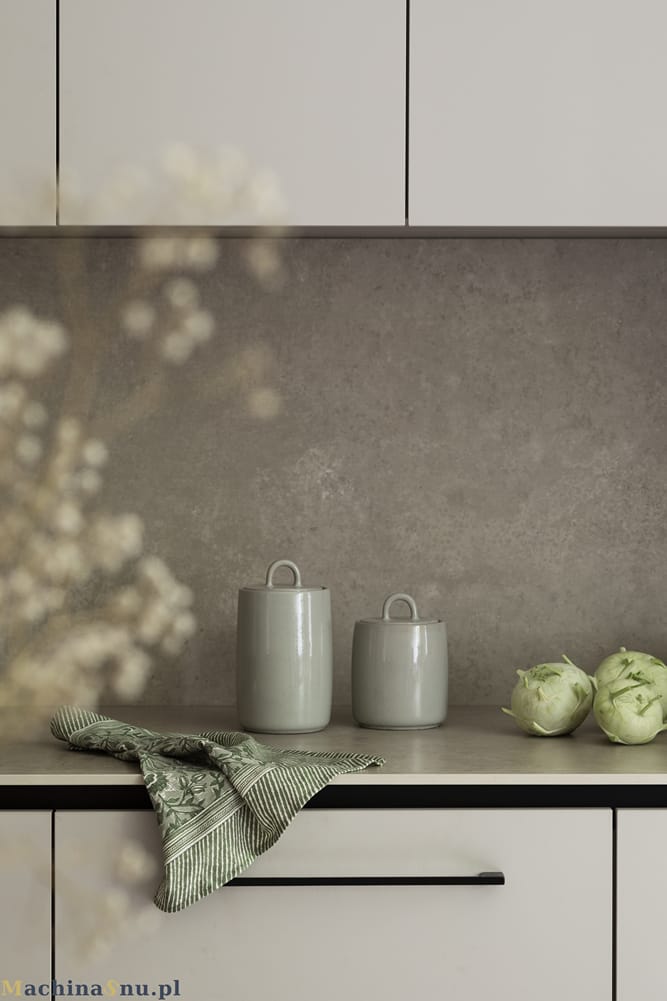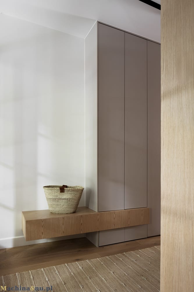 Kuchnia została zaprojektowana w duchu nowoczesnej prostoty, z ogromnym naciskiem na funkcjonalność i harmonię materiałów. Jej układ z centralnie umieszczoną wyspą stał się sercem życia rodzinnego – idealnym miejscem nie tylko do przygotowywania posiłków, ale i do wspólnych rozmów. Paleta materiałowa opiera się na dialogu faktur: minimalistyczna zabudowa o gładkich, matowych frontach w ciepłym odcieniu beżowej szarości została zestawiona z wysoką zabudową wykończoną naturalnym fornirem, który ociepla przestrzeń. Blaty oraz ściana między szafkami zostały pokryte niezwykle trwałym i łatwym w utrzymaniu konglomeratem Coverlam Moma Arena, którego faktura przypomina delikatny kamień. Ten spójny, elegancki monolit został przełamany czarnymi detalami – uchwytami, gniazdkami i listwami – które podkreślają nowoczesny charakter wnętrza.