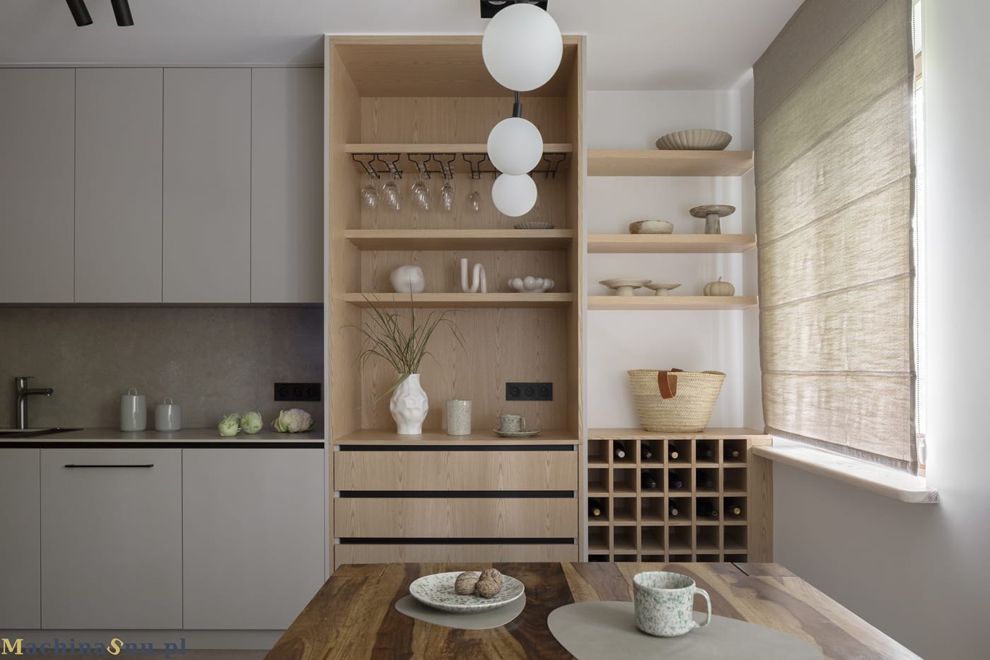 Ergonomia była dla nas słowem-kluczem. Za minimalistycznymi frontami kryją się zaawansowane systemy cargo i pojemne szuflady, które zapewniają łatwy dostęp do wszystkich niezbędnych produktów i akcesoriów. Wysoka zabudowa mieści nie tylko zintegrowane sprzęty AGD, ale także mnóstwo miejsca do przechowywania. Całość dopełnia przylegający do strefy jadalnianej, wykonany na wymiar regał z wbudowanym stojakiem na wino, który wprowadza do tej części domu element luksusu i wygody.