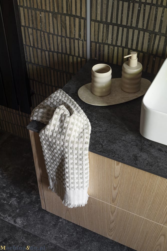 Artystycznym sercem tego wnętrza jest ściana za umywalką, wykończona unikalną, strukturalną płytką Flaviker Nordik Stone Domino Black. Jej geometryczny, pionowy wzór tworzy niezwykłą grę światła i cienia, nadając całej przestrzeni rzeźbiarskiego, niepowtarzalnego charakteru. Na jej tle zawisła wykonana na wymiar, wisząca szafka zwieńczona blatem z ciemnego kamienia, na którym stanęła prosta, prostokątna umywalka nablatowa Roca Inspira.