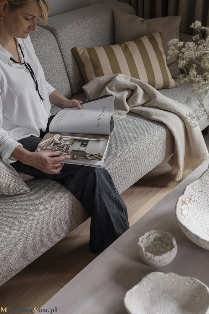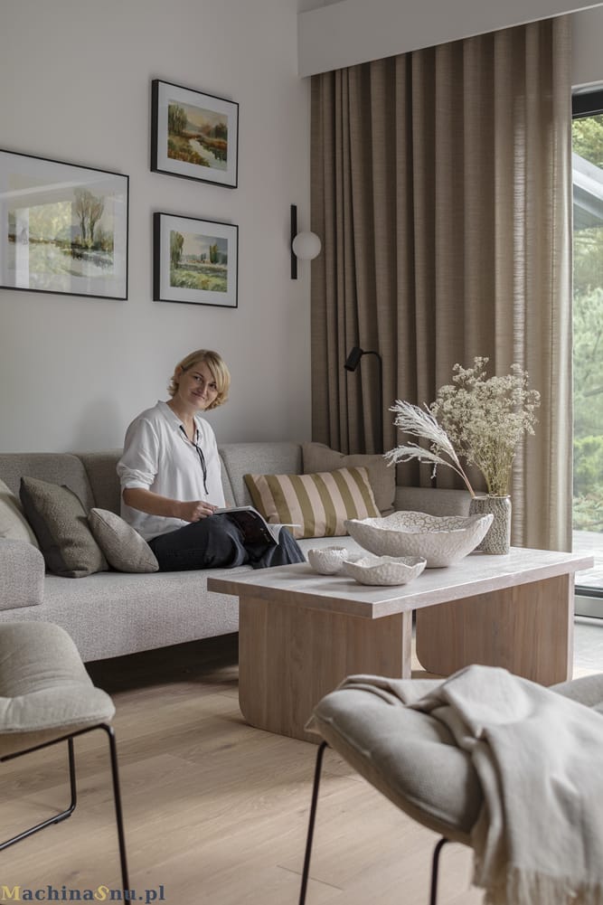 Równie istotną rolę w budowaniu atmosfery luksusowego komfortu odgrywają wysokiej jakości tkaniny. Dużą, rodzinną sofę w salonie otulają miękkie i przyjemne w dotyku materiały, a eleganckie zasłony w odcieniu piaskowego beżu nie tylko zapewniają intymność, ale także dodają wnętrzu miękkości. Starannie dobraliśmy również dodatki od marek premium, takich jak Bo Concept, Comforty czy NAP, których pledy i poduszki stanowią subtelny, kolorystyczny akcent.