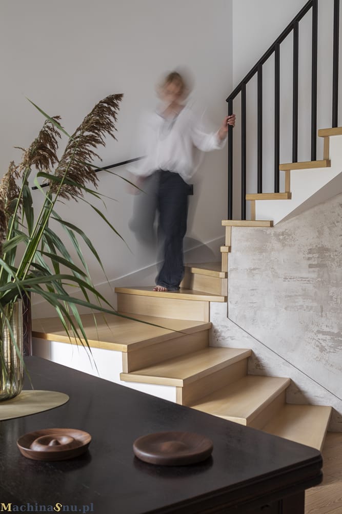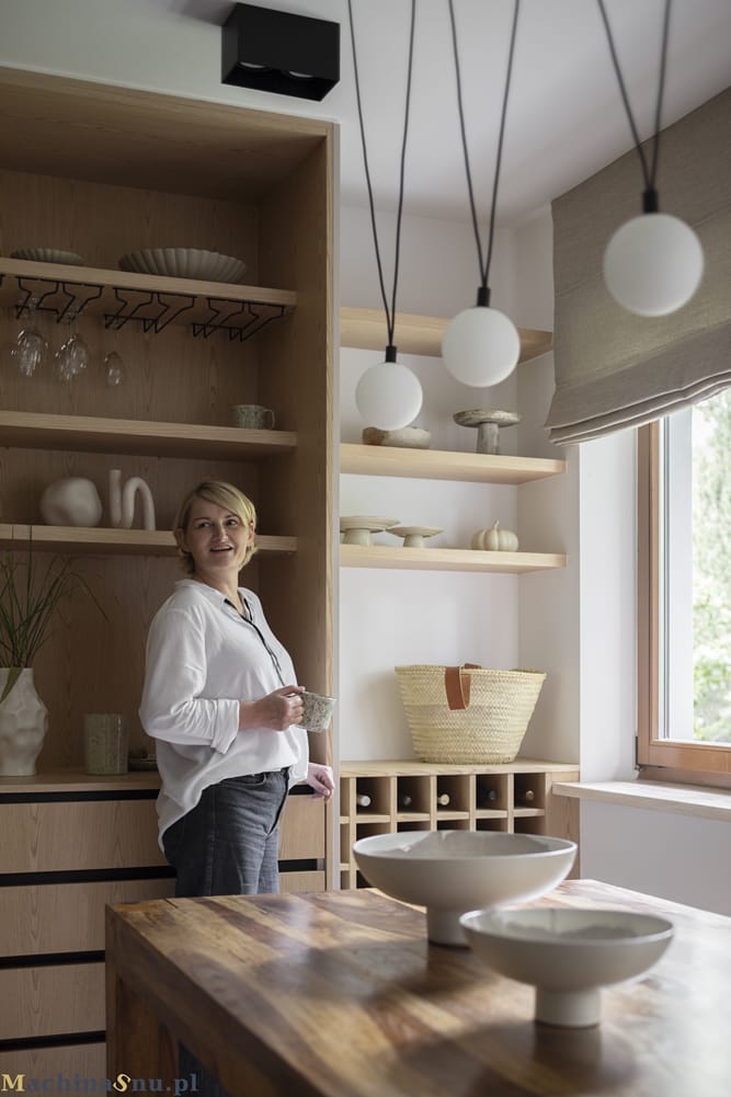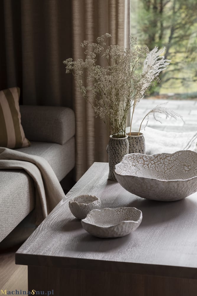 Ostateczny, unikalny charakter wnętrza jest jednak zasługą starannie wyselekcjonowanych, artystycznych detali. Rzeźbiarskie, dekoracyjne lampy w całym domu pełnią funkcję nie tylko użytkową, ale i estetyczną. Na stolikach i półkach znalazło się miejsce na ręcznie robioną, autorską ceramikę od artystów takich jak LUI & CLAY, Elza Jaszczuk czy Kasia Białek, która wprowadza do projektu element rzemieślniczego kunsztu. To właśnie ta suma przemyślanych decyzji i dbałość o każdy, nawet najmniejszy detal, sprawia, że dom staje się czymś więcej niż tylko sumą pomieszczeń – staje się spójnym dziełem.