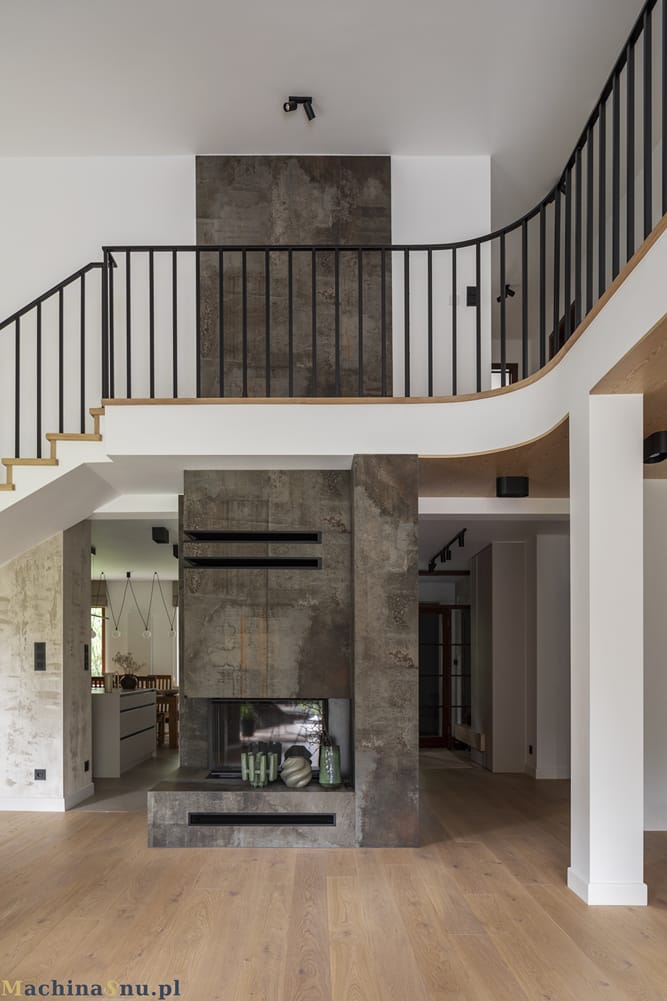 Architektonicznym ankerem całej strefy dziennej jest monumentalny kominek, wykończony wielkoformatowymi płytami spieku Apavisa TATOO OXIDIUM DECOR w odcieniach rdzawego betonu. Jego surowa, industrialna forma stanowi odważny kontrapunkt dla przytulności salonu i szlachetności antyków, a jego bryła płynnie łączy parter z otwartą antresolą, organizując całą przestrzeň domu.