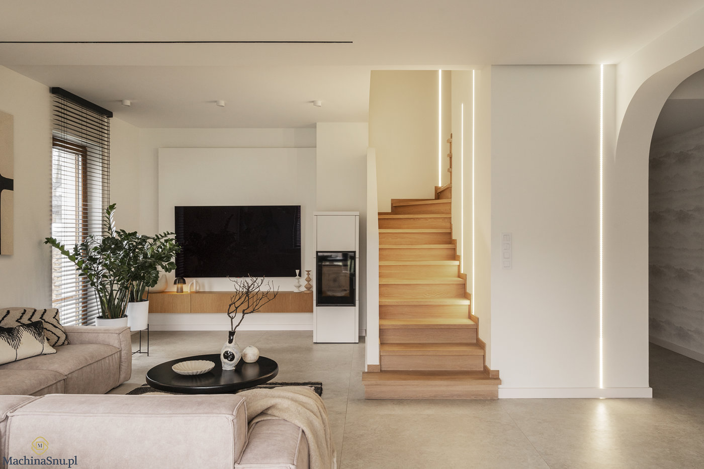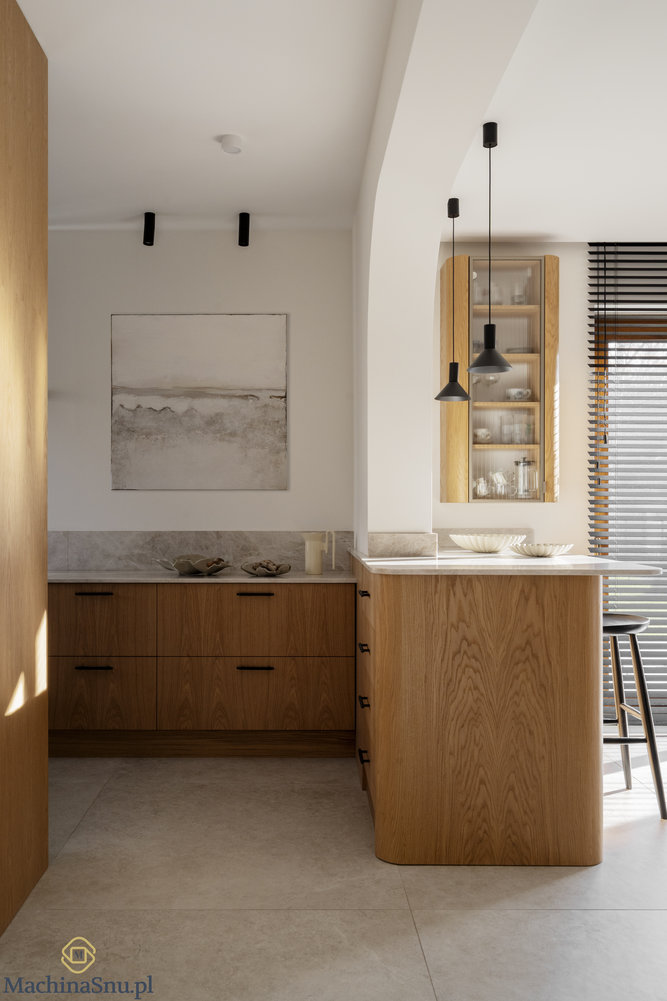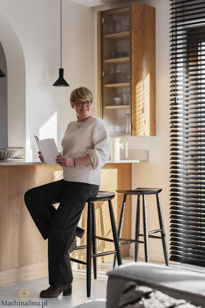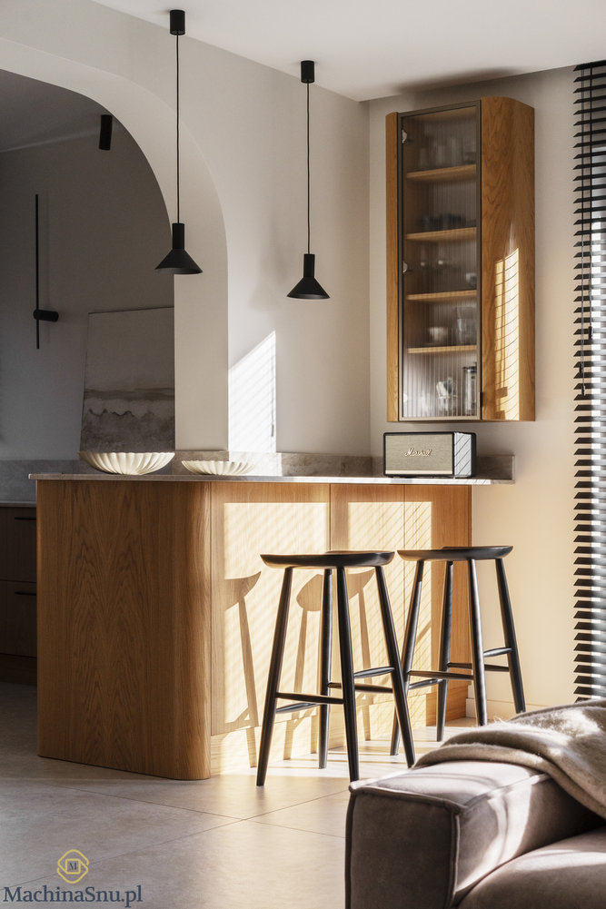 Wyzwaniem okazał się podciąg dzielący kuchnię od salonu. Zamiast go ukrywać, uczyniliśmy z niego element charakterystyczny — dekoracyjne łuki, które przewijają się przez cały dom. Rezultat? Wnętrze z własną tożsamością, które zachwyca od progu.