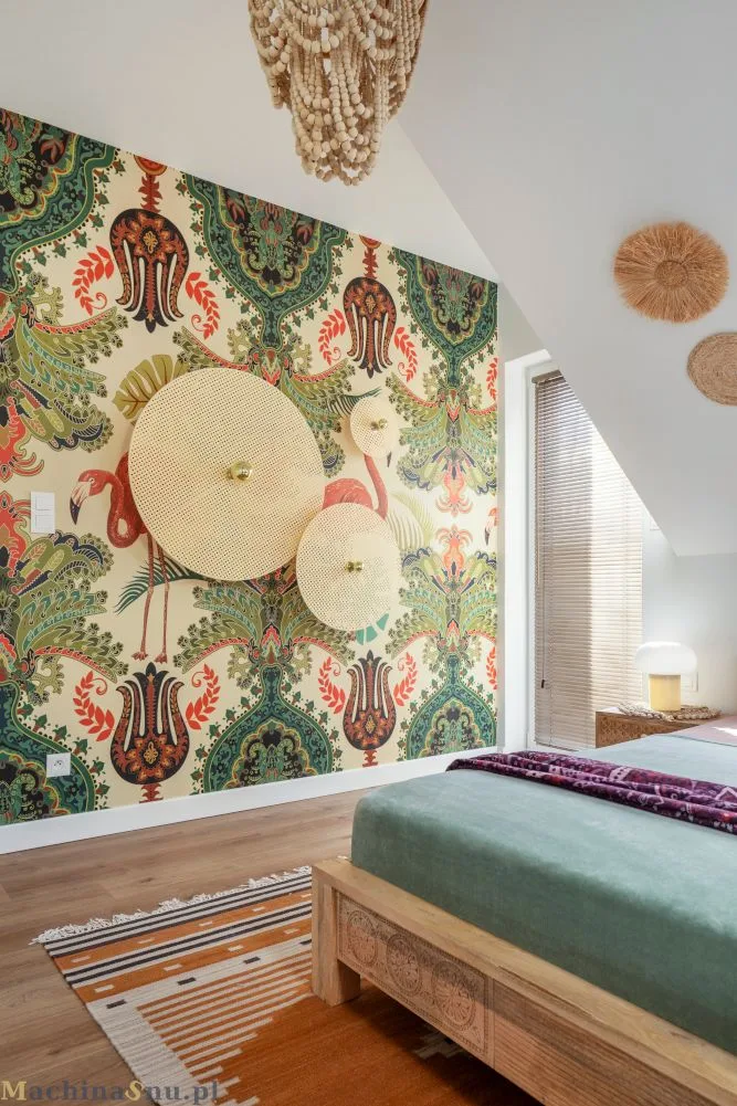 Sypialnia rodziców miała być ich prywatnym azylem – miejscem wytchnienia w sercu tętniącego życiem domu. Aby sprostać kluczowej potrzebie przechowywania, powiększyliśmy jej przestrzeň kosztem gabinetu, tworząc bardzo pojemną i wygodną garderobę. Ciepłe, naturalne materiały i spójna kolorystyka tworzą atmosferę relaksu i harmonii w stylu boho. To dowód na to, że funkcjonalność może iść w parze z intymnym, otulającym charakterem wnętrza.